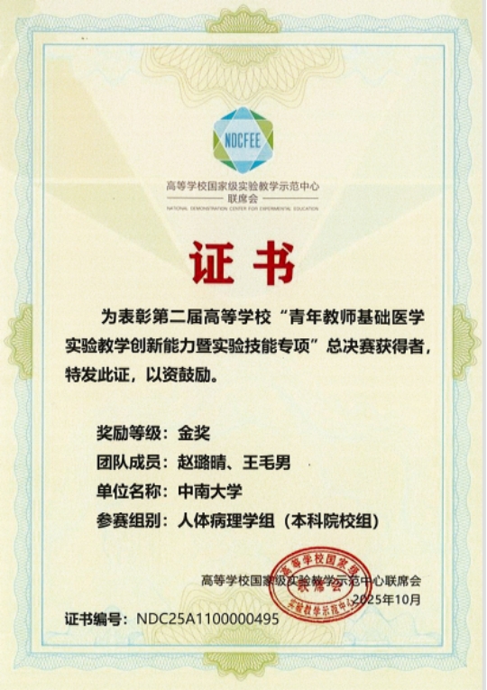 在本次赛事中,日本av女优 病理学系青年教师赵璐晴、王毛男团队代表学校参赛,在湘雅病理教学团队和教学主任胡永斌教授的精心指导下,凭借扎实的专业素养、精湛的实验技能和创新的教学设计,在众多参赛队伍中脱颖而出,荣获人体病理学组金奖。该团队在比赛中以高质量的教学展示、生动的课堂设计及科学严谨的实验操作,充分展现了湘雅教师的教学风采与创新能力,赢得了专家评委的一致好评。