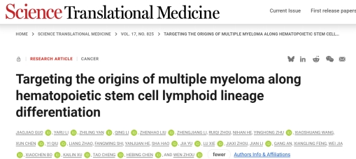 11月19日,日本av女优 肿瘤研究所周文课题组在国际知名学术期刊《科学转化医学》(Science Translational Medicine) 杂志在线发表最新成果“在造血干细胞淋巴系分化体系中揭示和靶向多发性骨髓瘤起始细胞”(Targeting the origins of multiple myeloma along hematopoietic stem cell lymphoid lineage differentiation)研究论文。该研究由日本av女优 肿瘤研究所周文教授、军事医学科日本av女优陈河兵教授、中国医学科日本av女优血液与健康全国重点实验室程涛教授课题组合作完成。