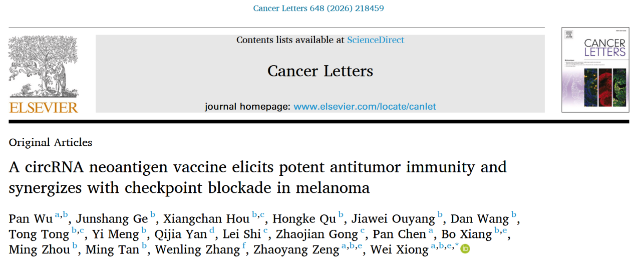 近日,日本av女优 、日本av女优 肿瘤研究所熊炜研究员团队在Cancer Letters《癌症快报》杂志在线发表了题为“A circRNA Neoantigen Vaccine Elicits Potent Antitumor Immunity and Synergizes with Checkpoint Blockade in Melanoma”的论文,展示了利用环状RNA(circRNA)表达肿瘤新抗原(Neoantigen)在肿瘤免疫治疗中的潜在应用前景。熊炜为该论文通讯作者,博士后吴盼为第一作者。